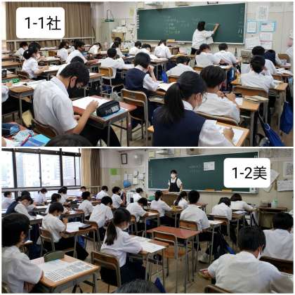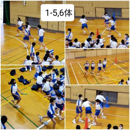 本日は朝から雨が降り続けています。本日の授業のようすです。体育の授業では、リレーのバトンの渡し方などを練習していました。