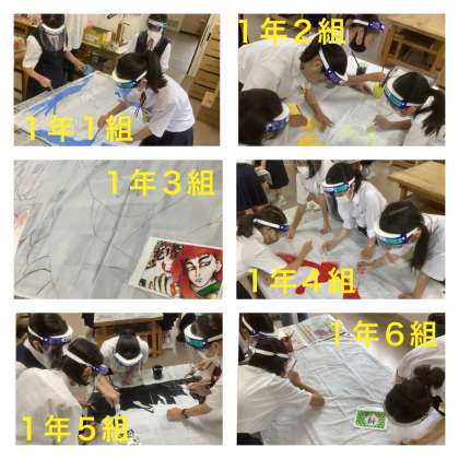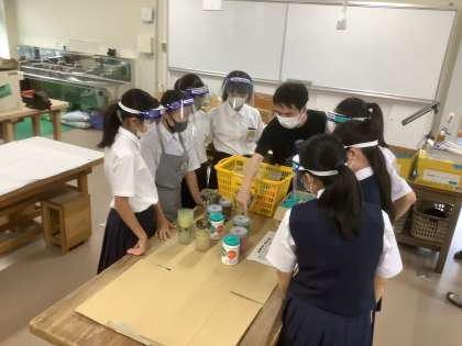 体育大会に向けて、学級旗の製作が本格的に始まりました。各学級で選んだ作品を学級旗の布に下書きを済ませ、今日から着色。感染症対策として、新技術室でしっかりと換気し、各クラスフェイスシールドを着けた4名以内の生徒での制作。30日の体育大会に向けて作業を進めます。