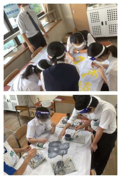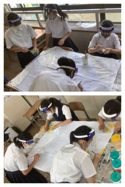 2年生の学級旗作成が始まりました。1教室に2クラスずつ、4人までのメンバーで作成していきます。感染症対策として、向かい合わせで作業するときにはフェイスシールドを着装しています。