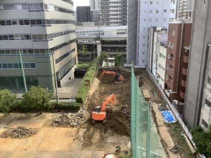 6月から8月には埋蔵文化財の調査が行われていた場所が、9月になり、地中の障害物除去の作業が本格化してきました。また、大型車両の通路の除草も終わりました。来月は杭工事の予定です。