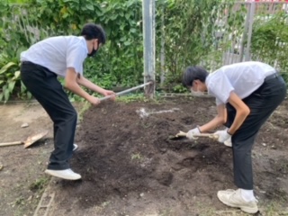 裏庭を耕して新たな畝を作り、アブラナの種を植えました。この種は、大阪市立南高等学校から分けていただいたものです。来年の春、3年生が卒業する頃に咲く予定です。
