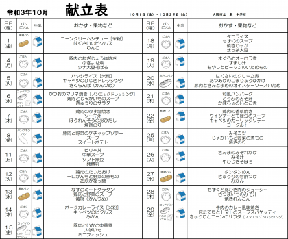 10月の給食献立表を掲載します。10月の給食は、中間テスト(3年生は7・8日、1・2年生は14・15日)の日の給食と、3年生は修学旅行(14・15日)と代休(18日)の日の給食は提供されません。10月行事予定でご確認ください。