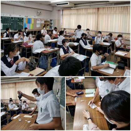 2年生の理科の授業のようすです。クラスの代表者がみんなの前で実験を行っていました。2つの物質を混ぜて発熱したり、冷たくなったりと化学反応が起こる様子を興味津々で確かめており、皆さん楽しそうに授業を受けていました。。
