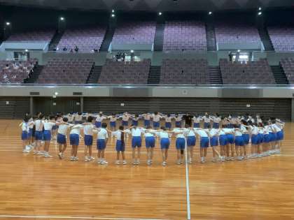 体育大会実行委員会のメンバーが気持ちを高めるエールの交換、選手宣誓の練習も終わり、準備万端。実行委員のメンバーに、スタンドで見守っている1・2年生から温かな拍手が沸き起こりました。