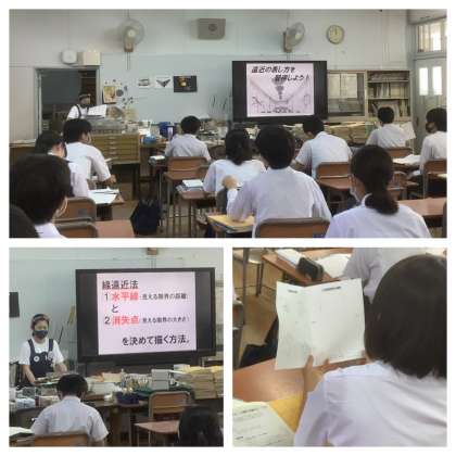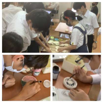 今日から始まった公開授業週間。先生方が授業改善をめざして、相互に参観し、意見交換をします。トップバッターは2年生の美術。陶芸の仕上げの絵付けをしている生徒と遠近法のデザインの習得をしている生徒がいます。一人ひとりが、それぞれの課題に一生懸命に取り組んでいます。