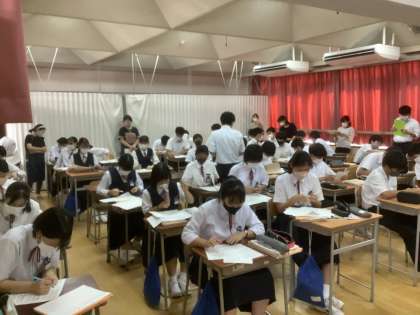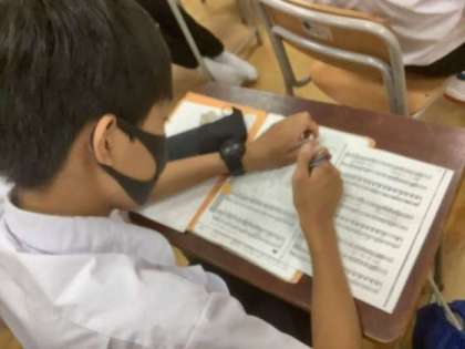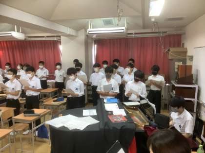 3年生の音楽の研究授業の様子です。混声三部合唱「時を超えて」を教材に、全体の響きや各パートの声を聴きながら、曲にふさわしい表現を工夫して歌うことをめざしています。感染症対策を徹底し、窓を開けて、新しく購入したサーキュレーターを稼働して換気をしています。