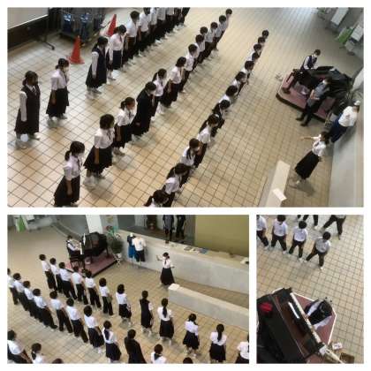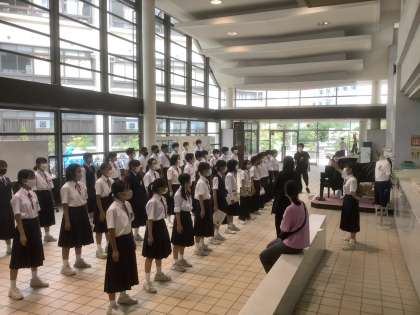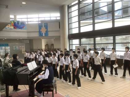 玄関ホールに、生徒の歌声・コーラスが響きます。緊急事態宣言が解除されたものの、マスクをつけての合唱ですが、一人ひとりの声が重なり、ホールに響きます。これから本番の28日(木)に向けて仕上げていきます。(写真は1年3組です)