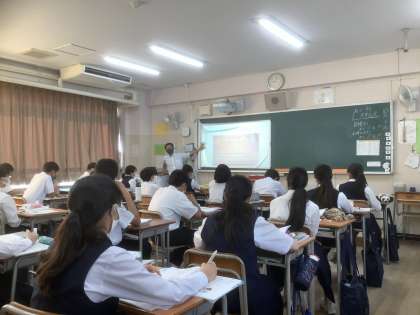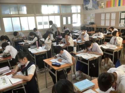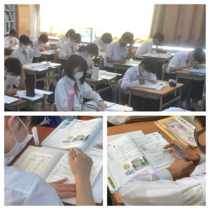 2年生の英語では、1年生で学習した「how」の意味の確認から始まり、「how to〜」(〜仕方)という表現について学習を進めています。英語の授業では、デジタル教科書を使用するだけでなく、PPTを活用したり、書画カメラを用いて学習のポイントを確認したりするなど、生徒の興味関心を惹きつけ、学習理解を促進する工夫が随所に見られます。明日は区役所事業による助成を利用した英検にチャレンジします。