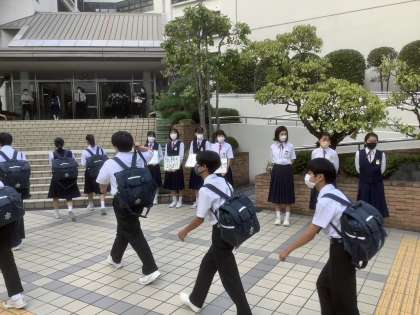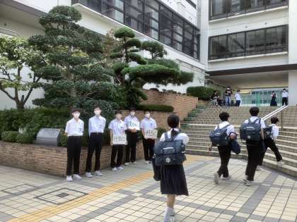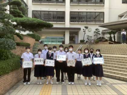 生徒会会長はじめ、本部役員が選挙を終え、新しい体制にバトンタッチ。認証式は来週19日(火)です。この1週間は引継の期間ということもあり、今日は新旧の役員合同で挨拶運動を行いました。新しい役員の皆さんは良き伝統を引き継ぎ、新しい歴史を創っていきましょう。旧役員の皆さん、コロナ禍のなか、1年間お疲れさまでした。この生徒会の経験を活かしてさらなる活躍を期待しています。