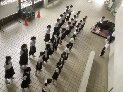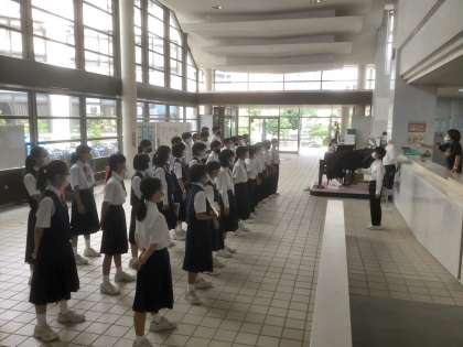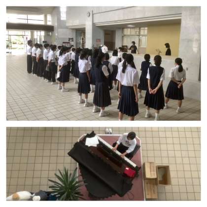 今日も玄関ホールに、生徒の歌声・コーラスが響きました。緊急事態宣言の解除後も、マスクをつけての合唱ですが、一人ひとりの声が重なり、ホールに響きます。これから本番の28日(木)に向けて仕上げていきます。(写真は1年1組です)