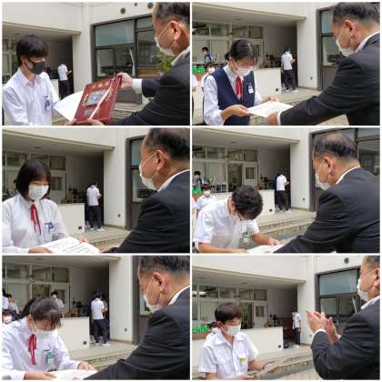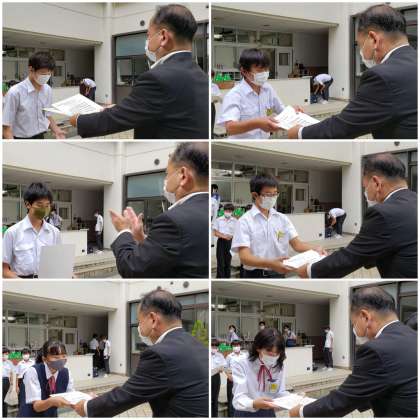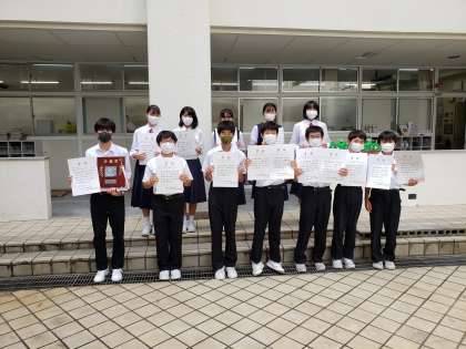 本日の昼休みに校長先生から表彰状の伝達が行われました。中体連第3支部大会で男子総合準優勝、女子総合第3位をはじめ、たくさんの個人入賞を果たしてくれました。おめでとうございます。