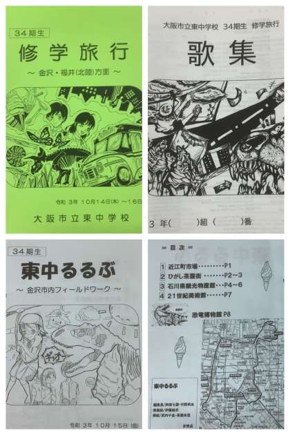 明日の出発を前に、修学旅行実行委員のメンバーが作成した「しおり」(先生方と共作)、「歌集」(大きな声では歌えないのが残念)、「東中るるぶ」(非売品)が完成しました。体育大会から10日余りですが、クオリティの高い仕上がりです。荷物点検も終わりました。最後の準備物は参加する一人ひとりの「心構え」です。気持ちを揃えて「一味同心〜どんな状況でも笑顔で成功させよう〜」を実現させましょう。修学旅行の成功は、誰かがするのではなく一人ひとりの心掛けが鍵を握ります。今日は早めに就寝して、早朝は、余裕を持って登校しましょう。