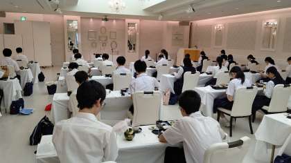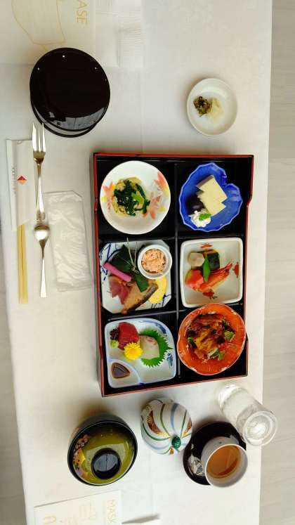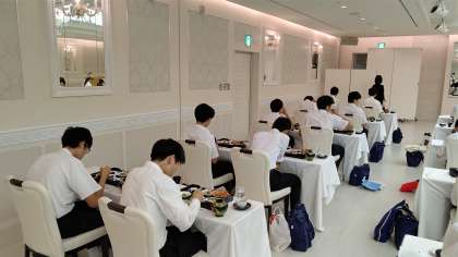 市内散策が終わり昼食を食べています。疲れていますが、みんな黙食を守っています。