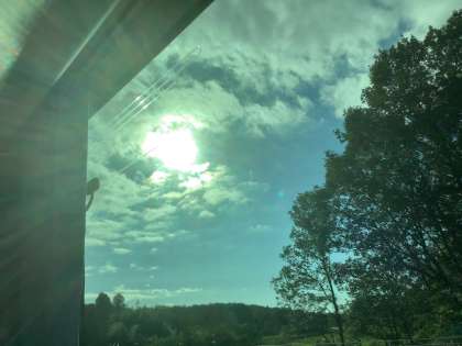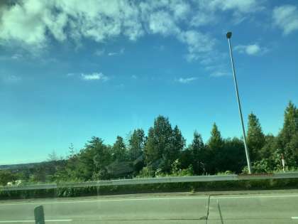 バスで休憩をしている生徒たちの向かう先は伝統工芸体験ができるゆのくにの森です。天気は雲はありますが晴れです。