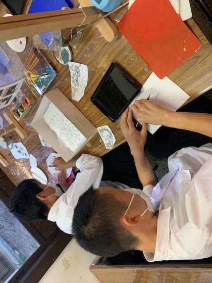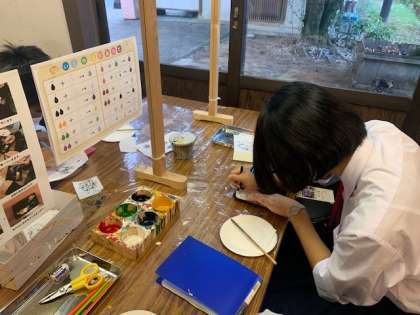 蒔絵体験です。まず下書きを行なってからお皿に絵を描いていきます。みんな真剣です!
