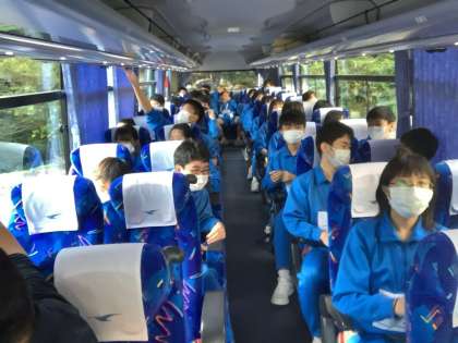 お世話になった宿舎の皆さまにお見送りしていただき、バスは定刻に出発し、ひこねSA(スカイアドベンチャー)に向かいます。途中、賤ヶ岳SA(サービスエリア)で、トイレ休憩の予定です。(8時NOW)