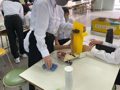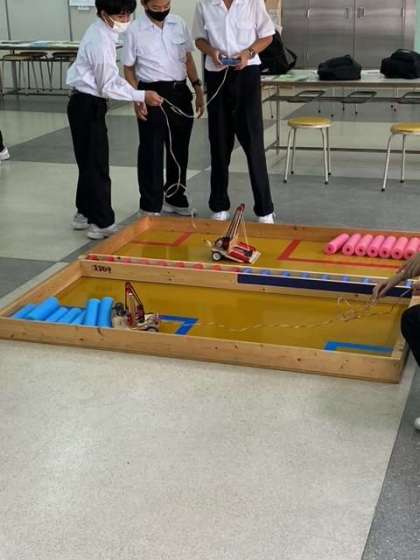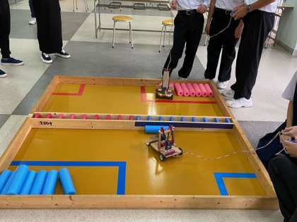 我孫子中学校で行われている総合文化祭にて、ロボコンデモンストレーションを行っています。他校と初めて練習試合をしたりと真剣です。