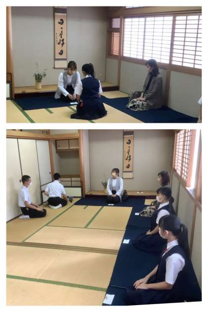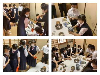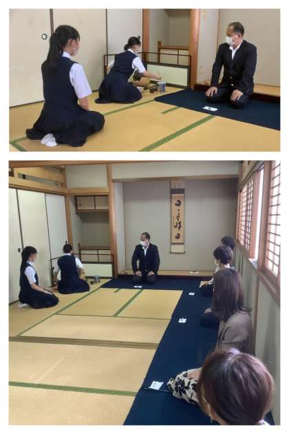 保護者の方と校長先生を正客にお迎えし、茶道部のお点前が行われました。3年生の活動も今日でひと区切りです。凛とした空気の中、お釜にお湯が沸く音が和室に響く、静寂な時間が流れました。