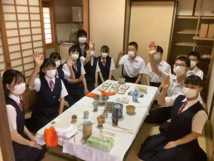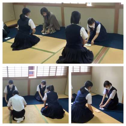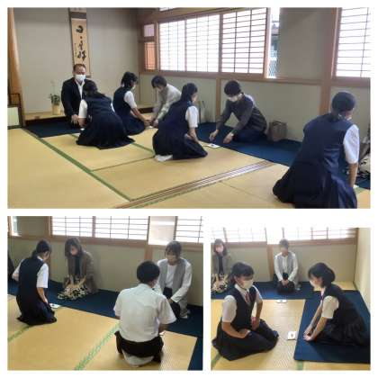 掛け軸には「日々是好日」。茶道部の皆さん、部活動指導員の先生と顧問の先生方とのお稽古を通して学んだことを、今後の生活に活かし、これからも一日一日を大切に過ごしましょう。