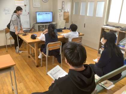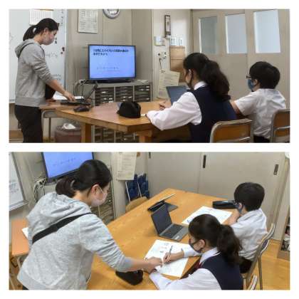 今日の授業公開は、わかくさ学級での1年生の数学の授業。「時速を求めよう」の単元で、「時速の求め方を理解し、自分で求めることができるようになる」ことをめあてに学習を進めています。一人1台の学習用端末や、授業用パソコンを工夫して利活用しながら、ワークシートに書き込みながら学習を深めています。一人で集中して学習する場面とペアでが学習する場面をうまく切り替えて、個に応じた深い学びになるように創意工夫が凝らされています。