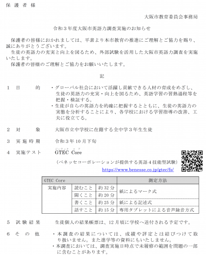 大阪市英語力調査実施(GTEC Core)のお知らせ