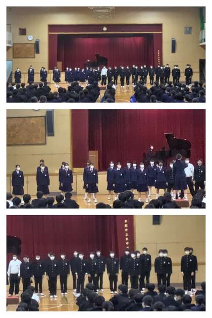 3年生合唱コンクールのトップバッターは5組。体育館全体が緊張感で包まれる中での合唱でしたが、しっかりと歌い切り、コンクール全体の成功に繋げました。
