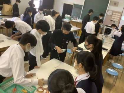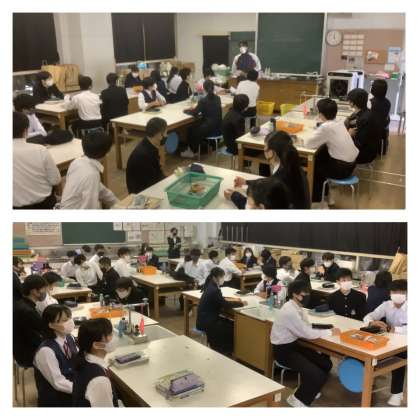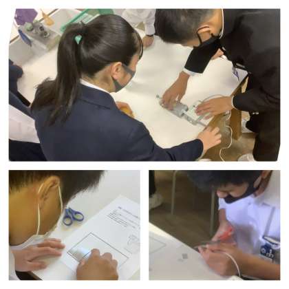 3年生では、理科室での実験を授業公開しました。久しぶりの実験は、等速直線運動。一人ひとりが順番に台車を転がして、考察用のテープを作ります。感染症対策をしつつ、できるだけ会話は控えて授業が進められました。