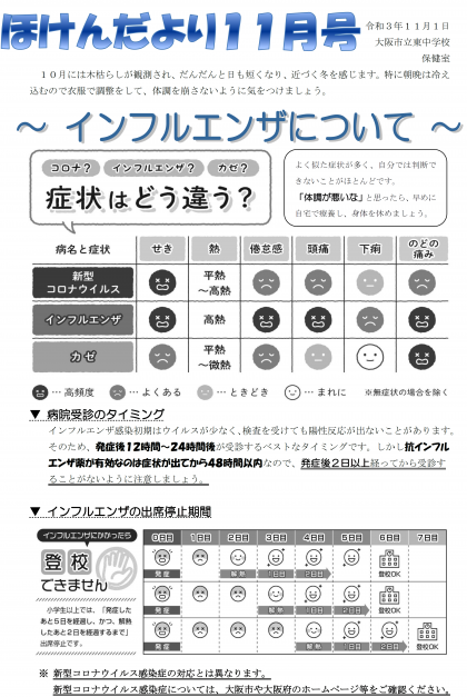 今朝の全校集会で校長先生から「インフルエンザの流行する季節が近づいていますが、新型コロナと症状が似ています」とのお話がありましたが、今日発行の「ほけんだより(11月号)」にその内容が掲載されていますので、ぜひご一読ください。