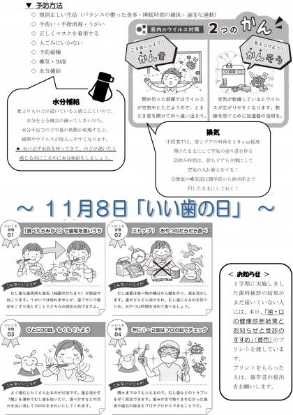 さて、ほけんだより(11月号)では、今朝話のあった「インフルエンザについて〜病院受診のタイミング・出席停止期間・予防応報」、裏面には「11月8日『いい歯の日』などについての記事が掲載されています。