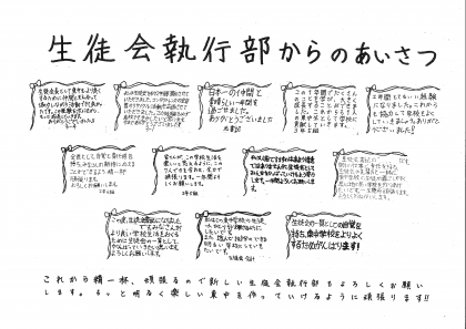 もと生徒会役員の皆さん、お疲れまでした。この経験をこれからの生活で活かしてください。新しい役員の皆さん、東中の代表としてのプライド、そして自覚と責任を心に秘めて、活動に励んでください。(こちらをクリックするとご覧いただけます。)