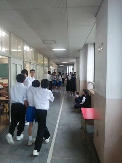 東中生は、廊下や階段で集まって楽しそうにしています。廊下が雨で濡れ、滑りやすくなっているので十分気を付けましょう。