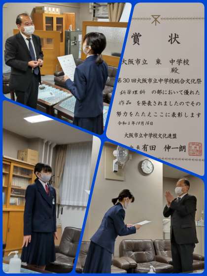 放課後の校長室では、第30回大阪市中学校総合文化祭『科学理科の部』で優秀な作品を発表した本校生徒への表彰式が行われました。