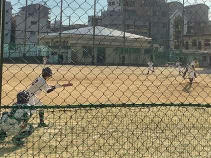 試合は、予定時刻より早くプレーボール。開始直後の1回表に、守備の乱れで1点先取される苦しいスタート。しかし、その裏の攻撃で、相手好投手の豪速球をレフトのフェンスを越えてプールにまで飛び込む特大のホームランですぐに追いつきました。
