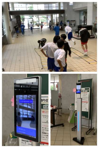 また、写真では奥の受付に、非接触の体温計を新たに設置しました。これはPTAからの寄贈品です。いつも東中生のためにありがとうございます。