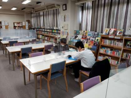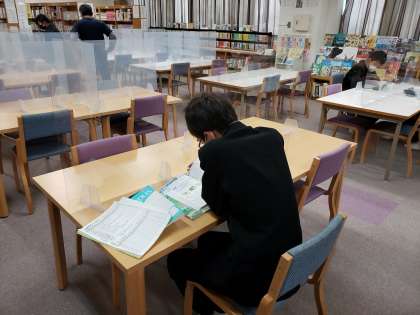 2学期の期末テスト1週間前となりました。図書館支援員さんと元気アップボランティアの方で、今日から図書室で放課後学習会を行っています。