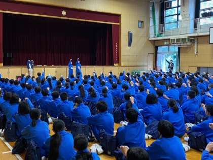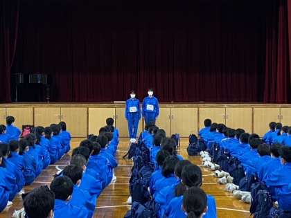出発式です。校外学習頑張りましょう!エイエイオー!