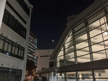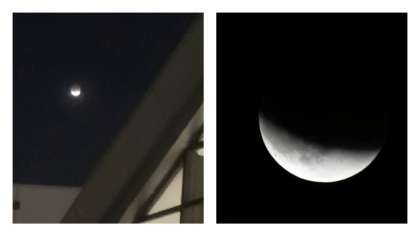 部分月食の様子が職員室前から綺麗に観測できます。宇宙空間で起こる奇跡の時間です。19時47分頃に部分月食は終わり、満月が観れるようです。