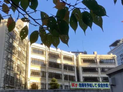 工事エリアになっているフェンスの向こう側の桜は、葉が色を変え、強い風に、一気に落ち葉になりました。