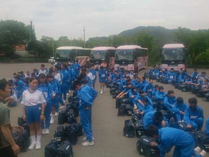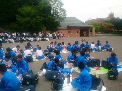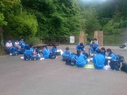 府立少年自然の家に到着し、集合・整列の後、集いの広島にて、昼食です。