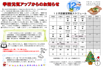 今月の学校元気アップ通信(表面)はこちらをクリックしてご覧ください。裏面の新しく届いた本の一覧はこちらをクリックしてご覧ください。