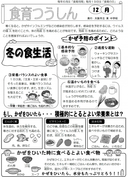 「食育つうしん」では、「冬の食生活」の記事に「かぜ予防のポイント」や、もし、かぜをひいたら積極的にとるとよい栄養素についての記事があります。
