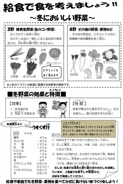 また、裏面の「給食で食を考えましょう!!」には「冬においしい野菜」や「冬野菜の効果と特徴」が紹介されています。今月は、冬野菜・果物を食べてかぜに負けない体づくりをしましょう!