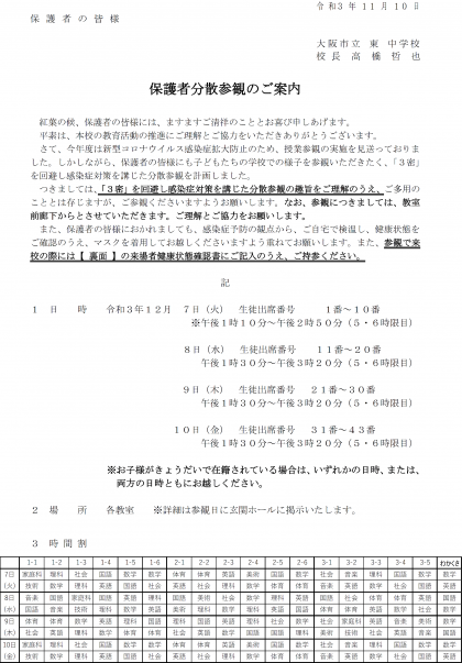つきましては、分散参観の趣旨をご理解のうえ、ご参観くださいますようお願いします。なお、参観につきましては、教室前廊下からとさせていただきます。ご理解とご協力をお願いします。