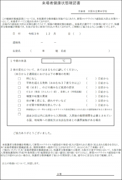 なお、ご来校の際は、お子様に出席番号をご確認いただき、感染症予防の観点から、ご自宅で検温し健康状態をご確認し、「来場者健康状態確認書」に必要事項をご記入のうえご持参ください。また、マスクを着用してお越しくださいますよう重ねてお願いします。
