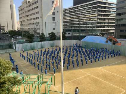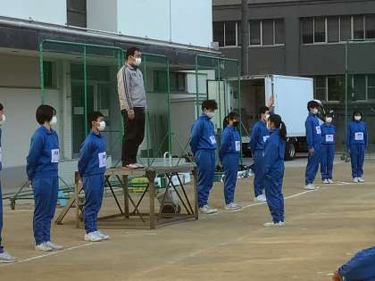 3年生の球技大会が始まります。体育委員の進行で開会式です。選手宣誓に続いて東中体操でウォーミングアップです。