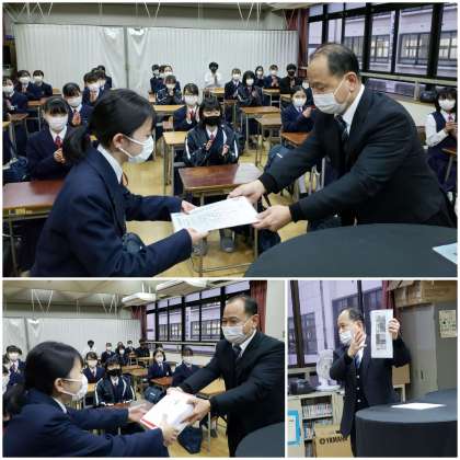 南大江地域文化祭『たんぽぽの会』で、今年10月の文化発表会で、吹奏楽部の演奏した映像が披露されました。昨年、今年とコロナの影響で生演奏については中止となりましたが、地域の方から吹奏楽部の部員に記念品をいただきました。