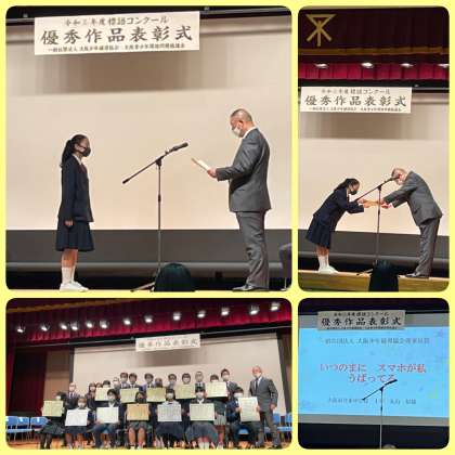 昨日12月24日(金)午後、一般社団法人 大阪少年補導協会・大阪青少年環境問題協議会 主催「令和3年度 標語コンクール 優秀作品表彰式」が行われ、本校からも1年生が受賞し参加しました。