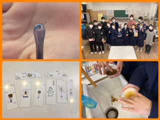 椀がけ法で鉱物を観察しています。キラキラの輝石や薬さじにくっつく磁鉄鉱を見つけることができました。最後は簡易な永久プレパラートを作成しました。