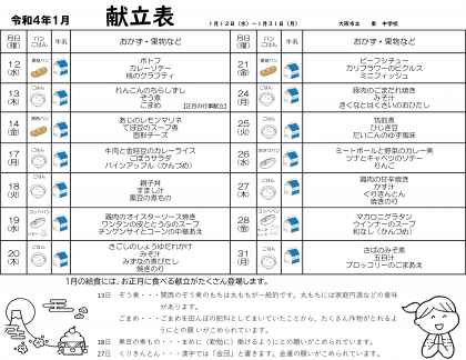 1月献立表(イラストVer)はこちらをクリックしてご覧ください。