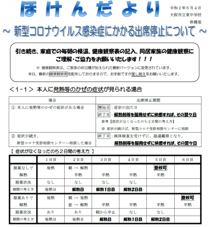 なお、発熱等により出席を見合わせた場合は、欠席とはせず出席停止となる場合がありますので、学校へのご連絡の際に症状等もお伝えいただきますようよろしくお願いします。